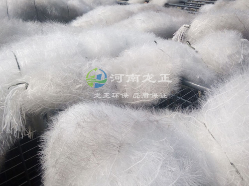 立體彈性填料篩選了聚烯烴類和聚酰胺中的幾種耐腐、耐溫、耐老化的品種,混合以親水、吸附、抗熱氧等助劑,采用特殊的拉絲,絲條制毛工藝,將絲條穿插固著在耐腐、高強(qiáng)度的中心繩上,由于選材和工藝配方精良,剛?cè)徇m度,使絲條呈立體均勻排列輻射狀態(tài),制成了懸掛式立體彈性填料的單體,彈性填料在有效區(qū)域內(nèi)能立體全方位均勻舒展?jié)M布,使氣、水、生物膜得到充分混滲接觸交換,生物膜不僅能均勻的著床在每一根絲條上,保持良好的活性和空隙可變性,而且能在運(yùn)行過(guò)程中獲得愈來(lái)愈大的比表面積,又能進(jìn)行良好的新陳代謝。